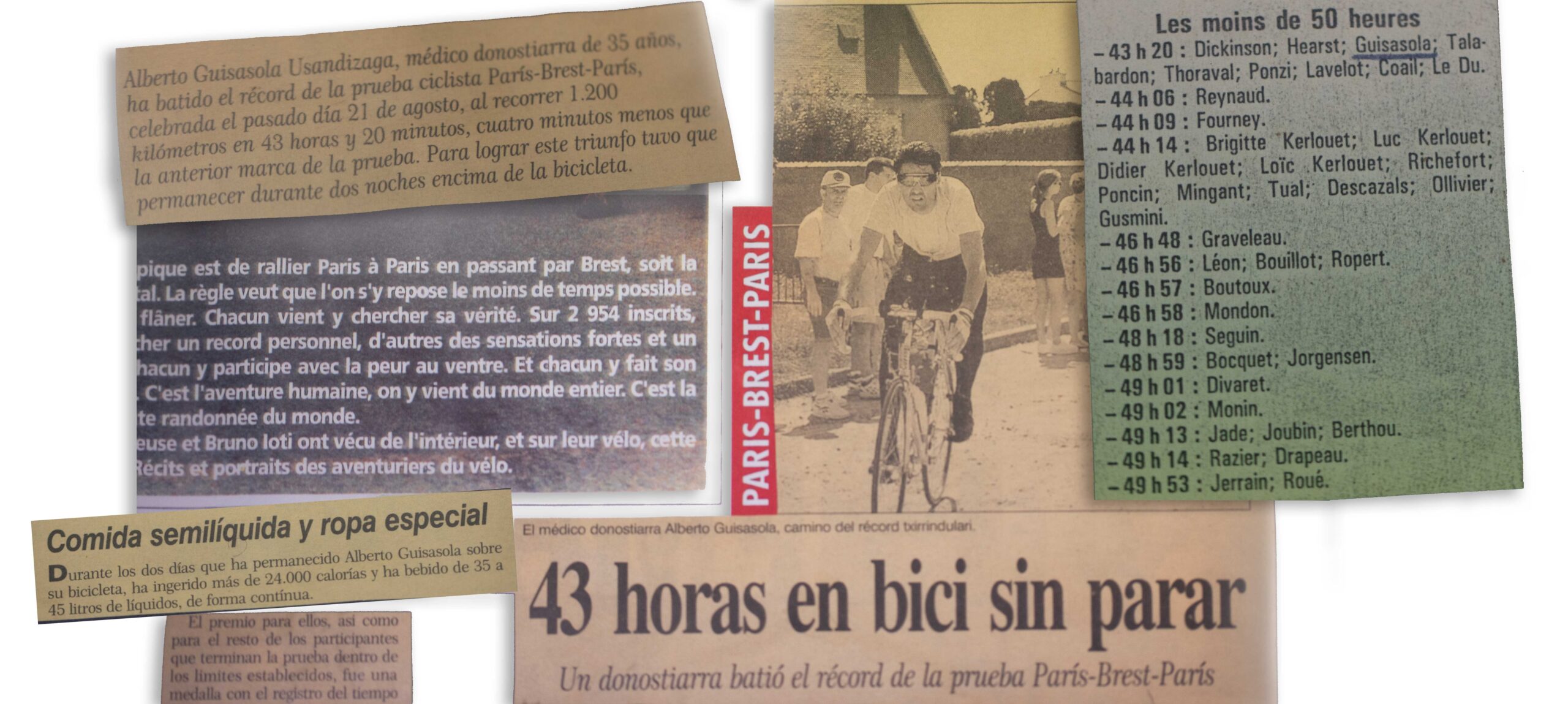 -Yo iba con un ciclista francés. Decidimos aflojar un poco para esperar a Dickson, vimos una luz al fondo de la noche y ahí venía el tío, con una tranca terrible, no sé, un 53x12 o algo así. Subía los repechos sentado con el plato grande. Nos pidió relevos, porque quería dejar atrás a De Munck, el belga que tenía la mejor marca hasta entonces y que venía cerca. Le ayudamos y entramos los primeros en París: Dickson batió el récord, 44 horas y un minuto; el francés y yo hicimos 50 horas y un minuto. A Guisasola le dio un poco de rabia, porque se quedó a un minuto de esa barrera que pocos ciclistas superan. Pero la experiencia le sirvió para mejorar en las siguientes ediciones: el conocimiento del terreno, los entrenamientos, la alimentación...- Y la parte psicológica, que es clave. Te vienen momentos muy duros, de cansancio, de hastío, te entran ganas de tirar la bici. Pero aprendes que si aguantas media hora, el cuerpo le da la vuelta, se enciende y marcha incluso mejor. Tu fisiología se va adaptando, es una pasada. Muchos ciclistas duermen un rato en la segunda noche pero Guisasola no lo hizo en ninguna de sus tres participaciones.