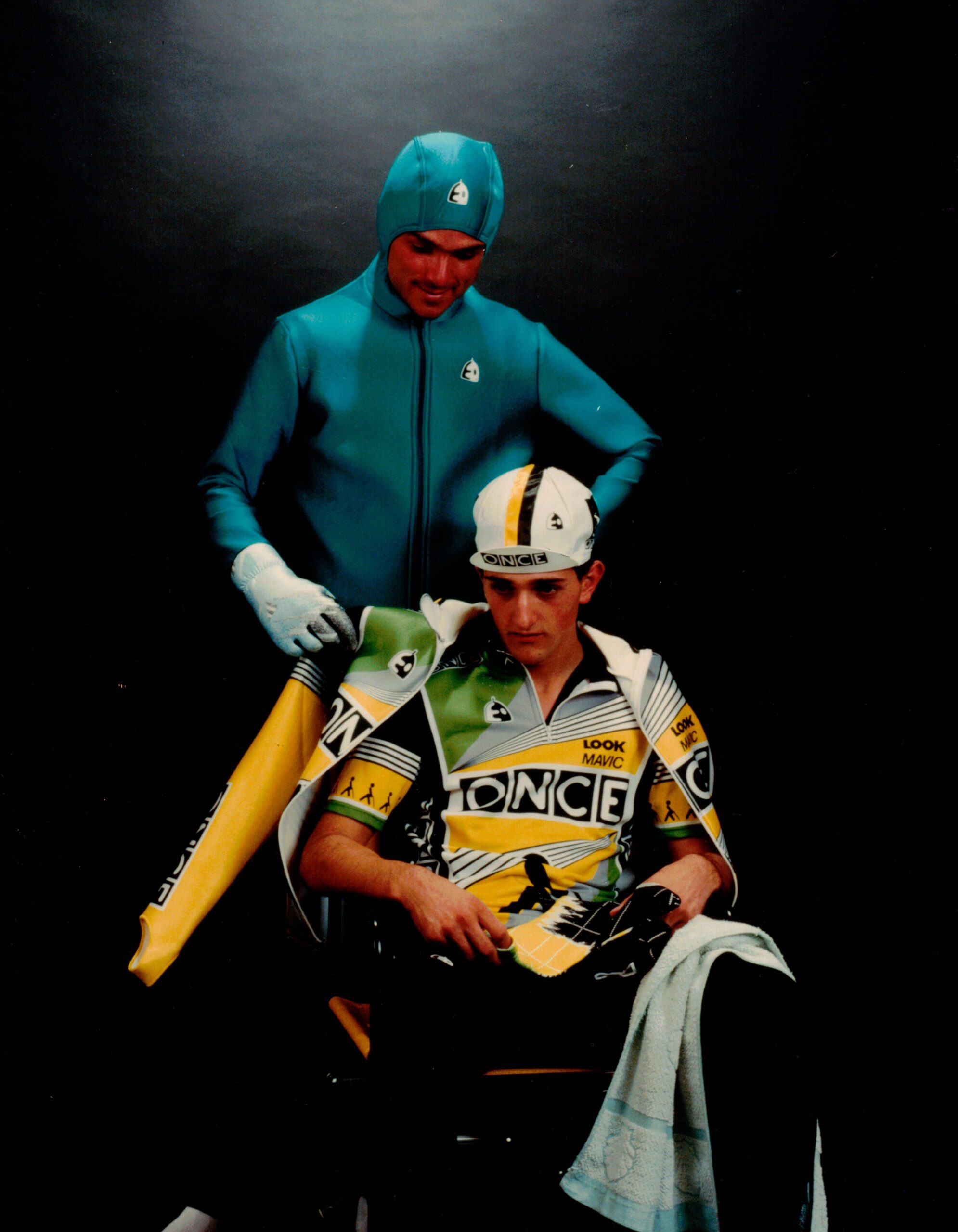 - Yo les preparaba minitemporadas dentro de una temporada. Un entrenador piensa en el presente y el futuro: si tiene 22 años lo entreno así, el año que viene con 23 será así, cuando tenga 25 será así… Al final planificas una vida deportiva. En aquel 1983 tan exitoso, Chozas corría con el Zor: el primer equipo profesional, junto con Reynolds, vestido por Etxeondo. Manolo Saiz conoció el trabajo de Paco Rodrigo con los equipos de los años 80 y cuando montó la ONCE le encargó la ropa. - Paco siempre conocía los mejores materiales, la última fibra que acababa de salir. A mí me gustaba mucho cómo perfeccionaba cada detalle. Nos entendimos muy bien. Me acuerdo mucho de aquella prenda de invierno con capucha, era el cambio de la lana a la fibra, que era más ligera y abrigaba más, empezamos con el goretex… ¡Y aquel buzo para que los ciclistas se recuperaran después de las etapas! - Os preparé un buzo negro especial, con thermolite, una fibra hueca, para mantener el calor -explica Paco Rodrigo-. Nada más terminar la carrera, los ciclistas se lo ponían hasta que llegaban a la ducha y al masaje. - Era un buzo muy bueno -sigue Saiz-. Hay una parte psicológica en todo esto: tú se lo vendes a los corredores, les explicas que están en el equipo que mejor recupera, cuando llegan a meta tienen inmediatamente la comida y la bebida idónea, les damos ese buzo para mantener la temperatura corporal, porque así el riego sanguíneo fluye mejor… Yo explicaba a los corredores por qué hacíamos cada cosa y eso calaba mucho. Los ciclistas estaban enamorados de las novedades de Paco.