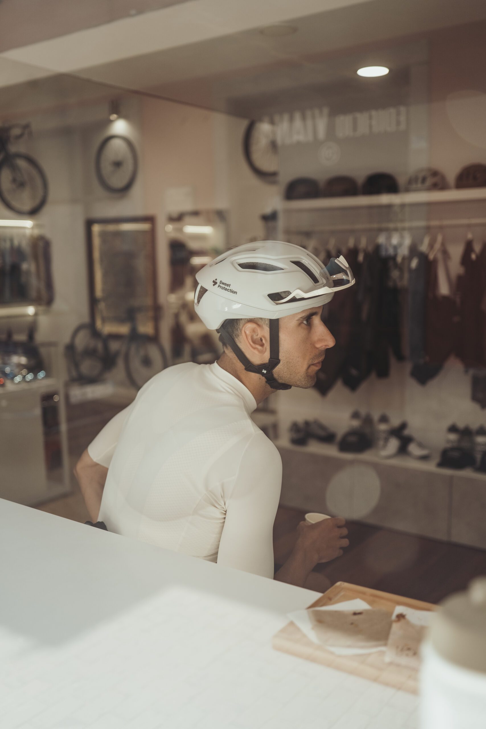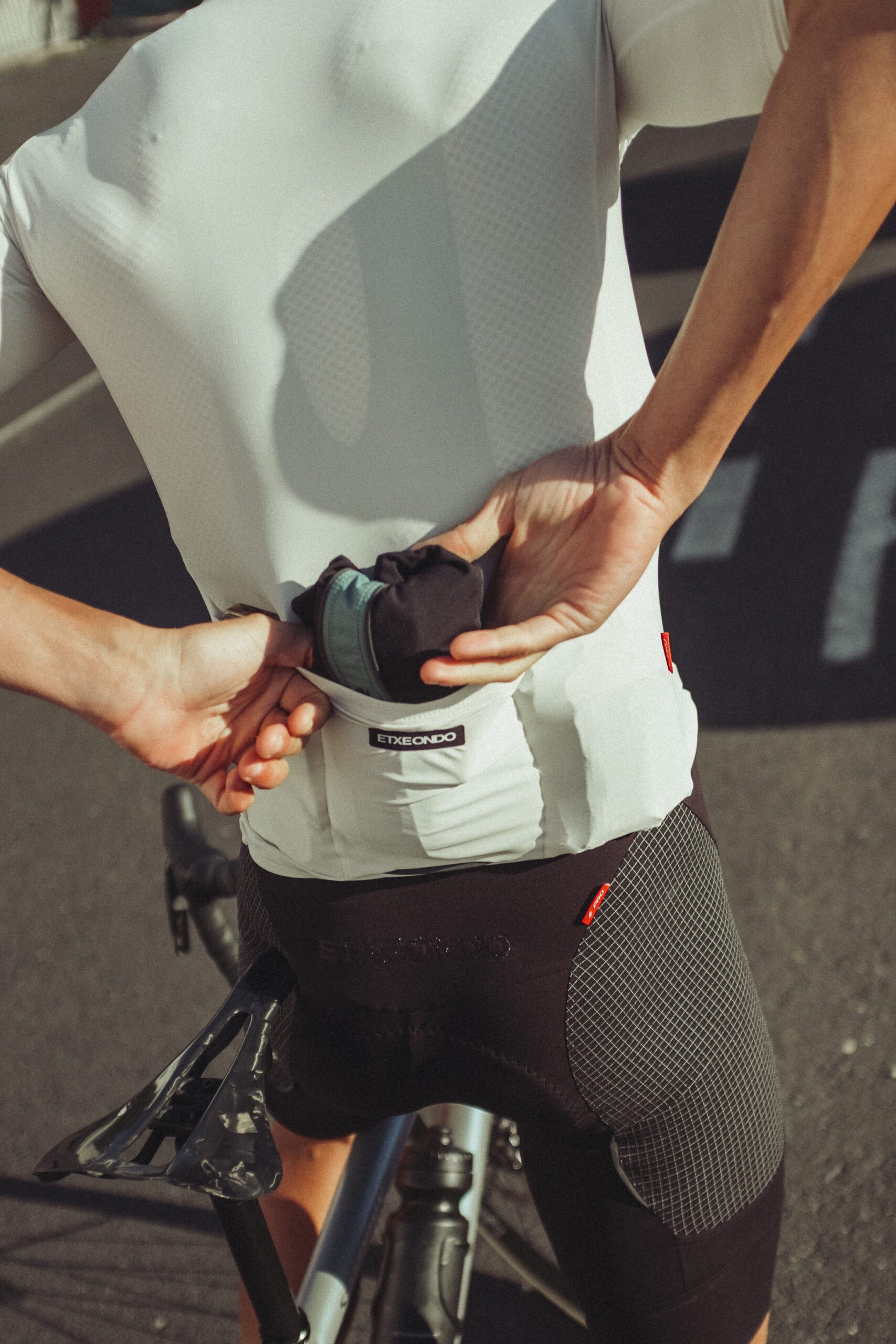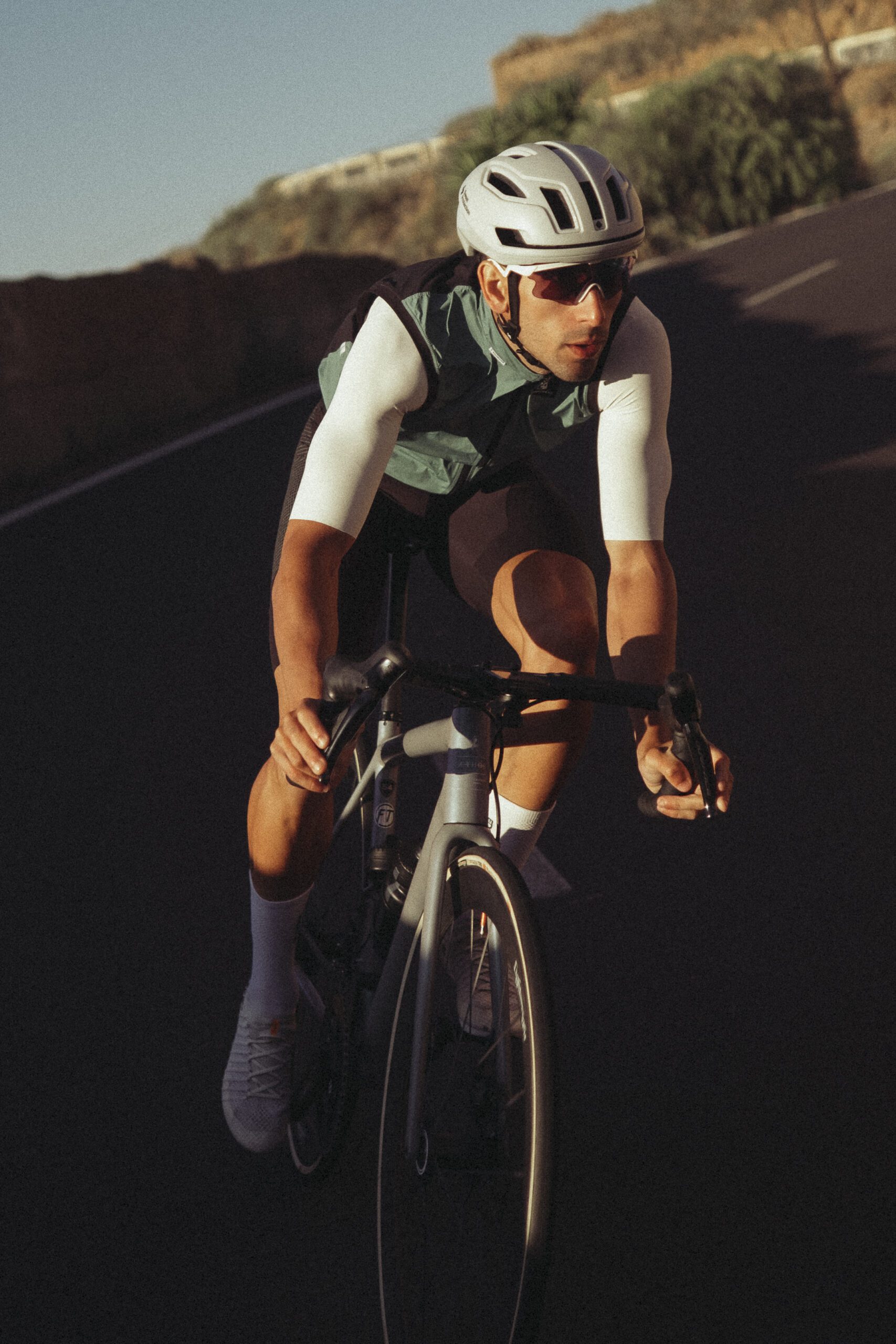 Dani Sanz lleva culote Orhi Dyneema, maillot Alde color marfil y chaleco Ligero.
