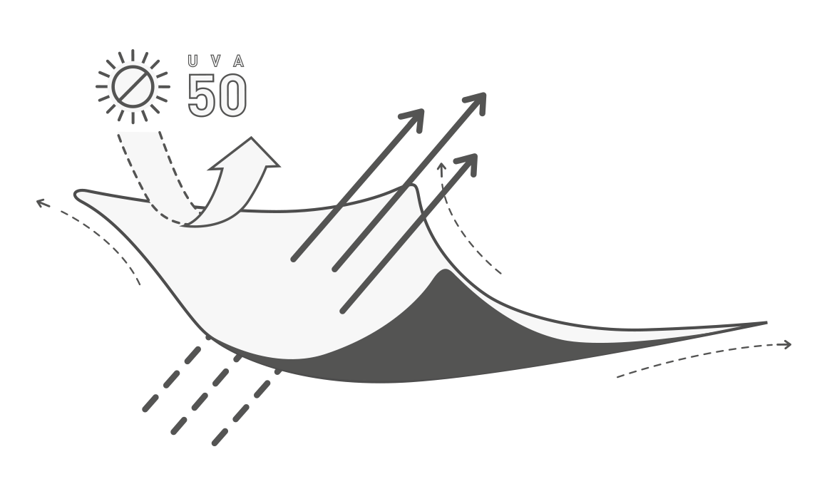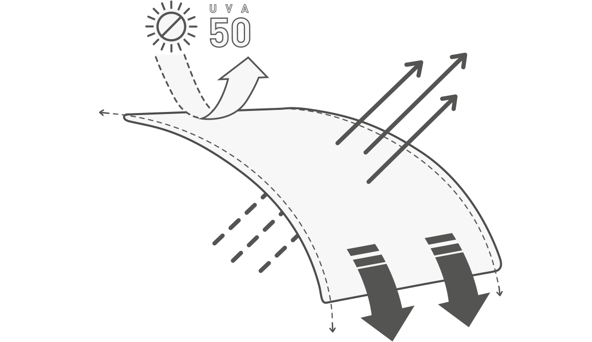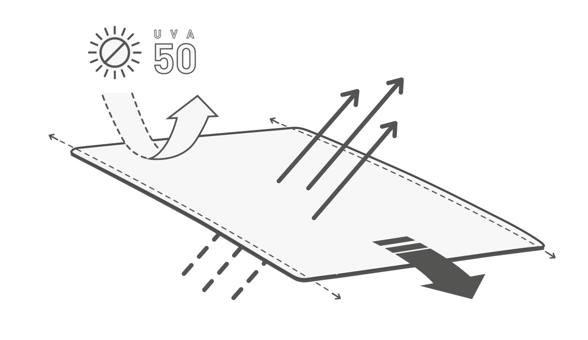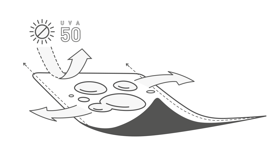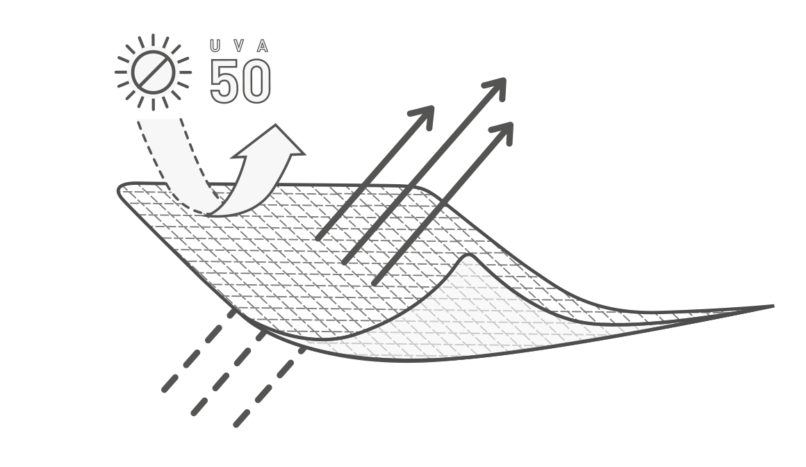 Tejido técnico desarrollado para conseguir una alta transpiración, compuesto de fibras ligeras que proporcionan una protección solar 50+ (UVA). La tecnología empleada en la unión de sus fibras permite obtener un tejido transpirable, elástico y flexible. Hilos de bajo volumen para mejorar la circulación de aire.